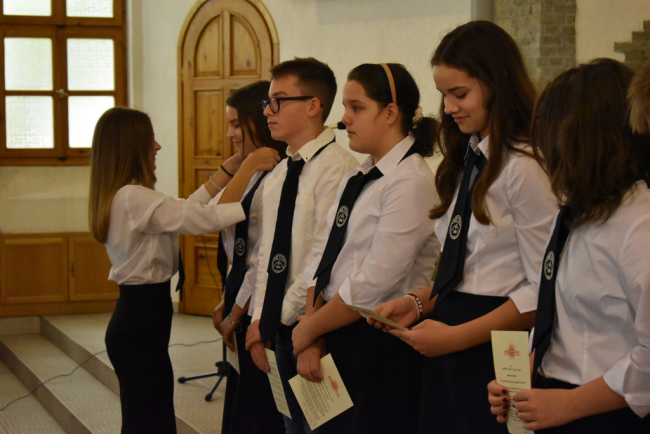 Október 8-án, Magyarok Nagyasszonya ünnepén befogadtuk új gimnazistáinkat. Ígérettel kötelezték el magukat, hogy tudatos, együttműködő, igazságra törekvő, felelős és alkotó fiatalokká válnak az előttük álló évek során. Ezután a végzős diákok átadták nekik a nyakkendőt - ezzel a a gimnáziumi közösség teljes jogú polgárai lettek. Az ünnepet kicsik és nagyok közös, felszabadult játéka zárta.