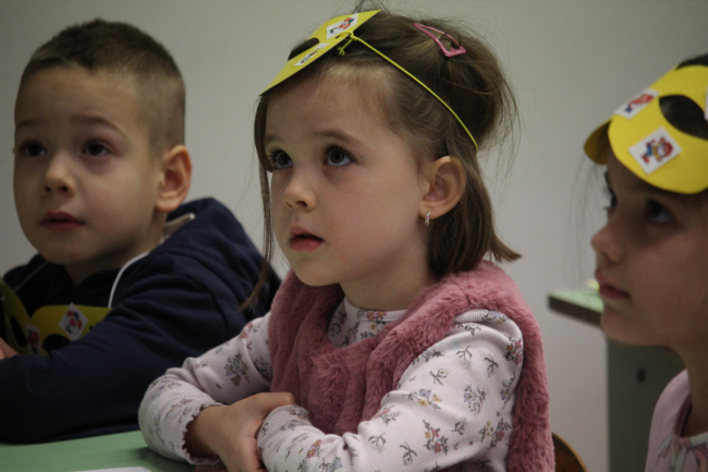 Az iskolába készülő óvodások a farsangra hangolódva érdekes iskolai feladatokat ügyesen, vidáman oldottak meg, természetesen most már az első és a második osztályos padokban ülve. Majd farsangi fánkot készítettünk, s eljártuk a farsangi táncot is.