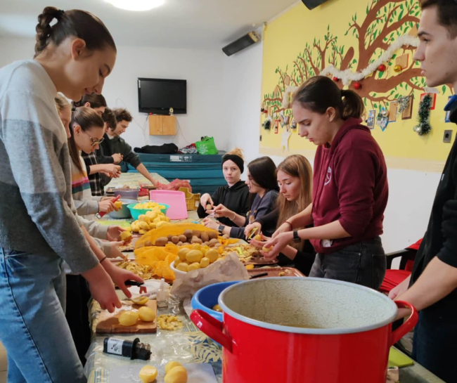 Január 17-én a 12. évfolyam tagjai, osztályfőnökeik és Kubinyiné Mikó Ágnes tanárnő 350 adag paprikás krumplit főzött és osztott ki a város rászorulóinak.