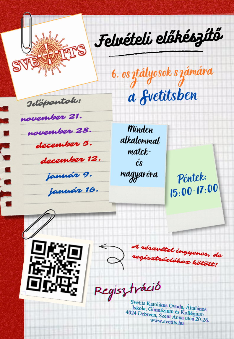 A Svetits Katolikus Gimnázium intenzív felvételi előkészítőt hirdet 6. osztályos tanulók számára. Az előkészítő során magyar és matematika tantárgyból segítjük a diákokat a sikeres központi írásbeli felvételire való felkészülésben.