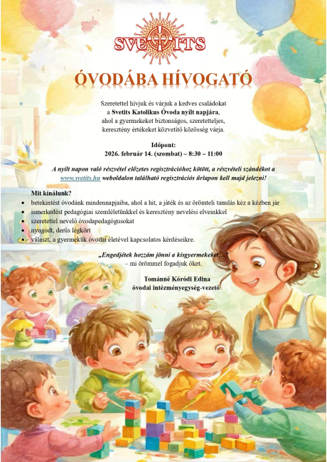 Február 14-én (szombaton) kerül megrendezésre Óvodába hívogató nyílt napunk, ahol a Svetits Katolikus Óvoda szeretetteljes, biztonságos, keresztény értékeket közvetítő közösségébe nyerhetnek betekintést az érdeklődők.